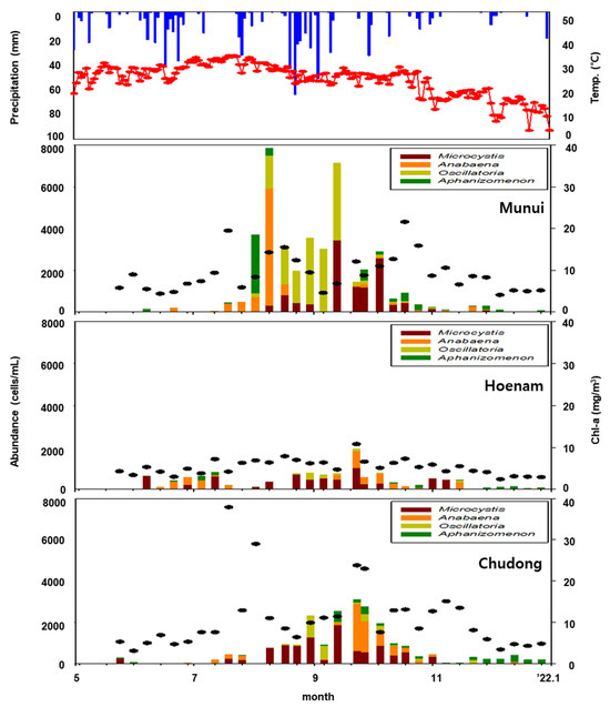Four species of harmful blue-green algae were initially detected at three sites (Munui, Hoenam, and Chudong) at Daecheong Dam between May and October 2021. These algae first appeared at the dam towards the end of May and were present at all sites from June onward (Figure 4). The maximum concentration of blue-green algae was highest at the Munui site, with a maximum of 7866 cells/mL. The concentration remained high at other times of the year, except for a maximum of 1940 cells/mL at the Hoenam site, which was consistently below 1000 cells/mL. In addition, a comparison of the maximum values of the four species at each site showed that the Anabaena genus exhibited the highest values of 5614 and 2280 cells/mL at the Munui and Chudong sites, respectively. Moreover, the abundance of the Microcystis genus was the highest (1000 cells/mL) at the Hoenam site. The difference in concentrations among the survey points within Daecheong Dam was significant because of its substantial size, encompassing a reservoir area of 72.8 km2 and a total reservoir capacity of 1490 million m3 (www.water.or.kr (accessed on 22 March 2024)).