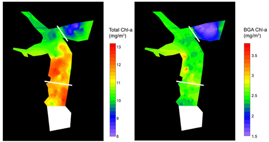 Based on the area-by-area analysis of the surface layer, which revealed a decrease in concentration after the fence, we concluded that it effectively prevented the passage of blue-green algae downstream (Figure 6). The results of point-by-point measurements demonstrated that the values varied based on the frequency and location of the measurements. Therefore, it is advisable to conduct basin-wide measurements to obtain accurate data.