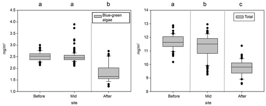 ANOVA results of the algal fences installed at Daecheong Dam (left: blue-green algal Chl-a, right: total Chl-a, a, b and c: groups divided by ANOVA results).