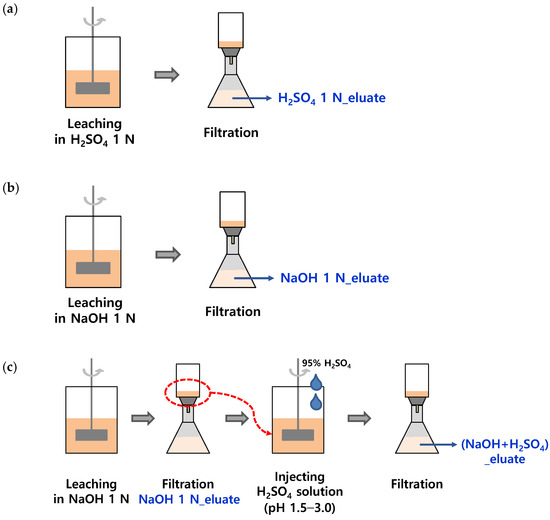 Sequential wet chemical treatment of SSA for phosphorus recovery was performed to simultaneously maximize the leaching of phosphorus and reduce heavy metals. The sequential phosphorus elution procedure is shown in Figure 1c. In the first step, 50 g of SSA was eluted with 500 mL of a NaOH 1 N solution (L/S ratio of 10) for 30 min in a jar tester, followed by filtration of the alkaline eluate through a GF/C filter. In the second step, the alkaline-treated residue was recovered and re-eluted with 500 mL of a H2SO4 solution. The H2SO4 solution (95%) was injected into the eluate to adjust the pH to 1.5, 1.75, 2.0, and 3.0. Each mixture was stirred for 30 min in a jar tester and then filtered through a GF/C filter. The concentrations of PO4-P and heavy metals were compared with those of the acidic and alkaline eluates.