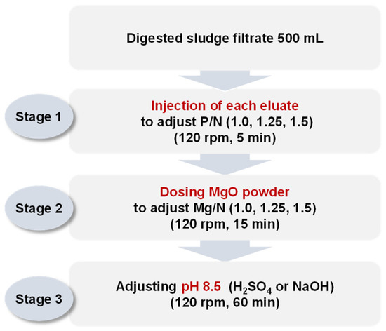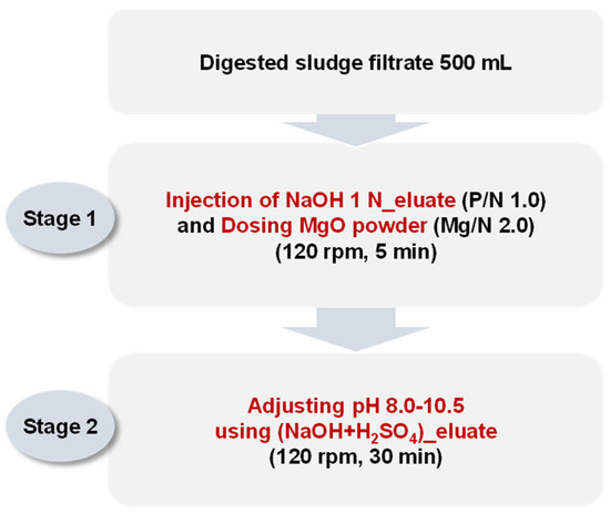 Jar tests were performed by sequentially injecting both the NaOH 1 N_eluate and (NaOH+H2SO4)_eluate. The (NaOH+H2SO4)_eluate was injected for pH adjustments between 8.0 and 10.5, with an additional phosphorus supply. The detailed experimental method is shown in Figure 3. The NaOH 1 N_eluate was injected into 500 mL of the digested sludge filtrate to adjust the P/N molar ratio to 1.0. MgO was then injected into the mixture to adjust the Mg/N molar ratio to 2.0. The mixture was stirred at 120 rpm for 5 min.