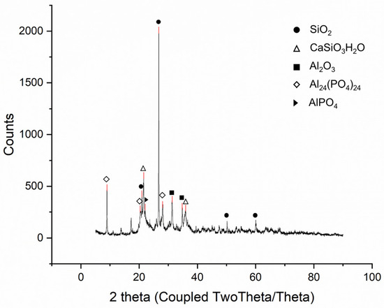 SSA from the ‘N’ wastewater treatment plant (Seoul, Republic of Korea) was analyzed via XRF and XRD to examine its properties; the results are presented in Table 1 and Figure 4. The XRF analysis revealed that the main components of SSA were Al2O3, P2O5, and SiO2, whereas the secondary components were CaO, Fe2O3, and MgO. The phosphorus content of SSA was approximately 10.9% (P2O5 24.9%).