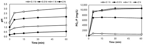 The results of the leaching tests using H2SO4 are shown in Figure 5. After mixing the SSA in H2SO4 0.1–2.0 N for 60 min, the pH of the mixture was between 0.6 and 3.1. PO4-P was eluted in the range of 570–10,720 mg/L, and when the concentration of H2SO4 was higher than 1 N, the same leaching phosphorus concentration was observed after 30 min, regardless of the concentration of H2SO4. The eluted phosphorus reached 5.2–98.4% of the total phosphorus content in SSA.