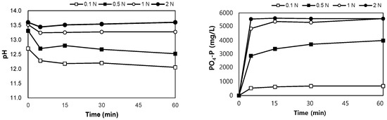 The results of the leaching tests using NaOH are shown in Figure 6. After mixing the SSA in NaOH 0.1–2.0 N for 60 min, the pH of the mixture was between 12.1 and 13.6. PO4-P was eluted in the range of 690–5580 mg/L, and when the concentration of NaOH was higher than 1 N, the same leaching phosphorus concentration was observed after 30 min, regardless of the concentration of NaOH. The eluted phosphorus corresponded to 6.3–51.2% of the total phosphorus content in SSA.