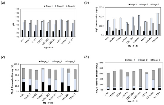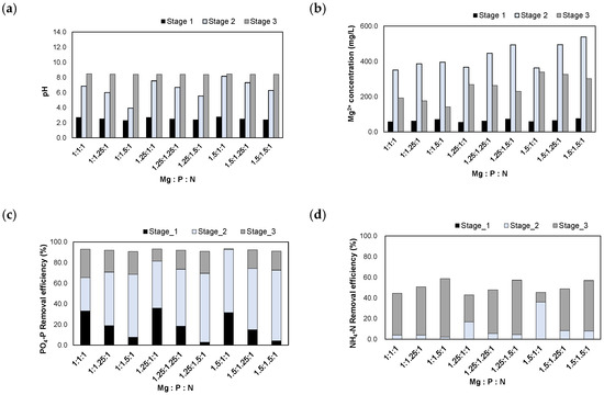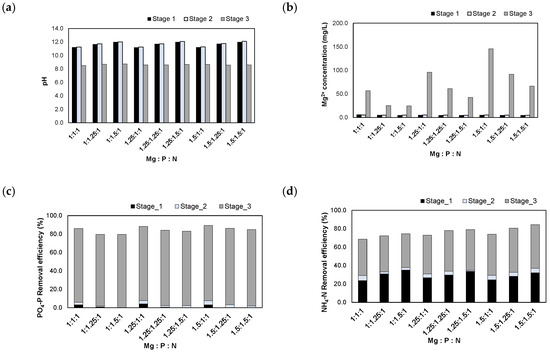 Results of injecting the (NaOH+H2SO4)_eluate in accordance with the Mg:P:N molar ratios: (a) pH; (b) Mg2+ concentration; (c) removal efficiencies of PO4-P; (d) removal efficiencies of NH4-N.