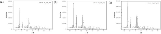 The precipitates of each experiment (Mg:P:N = (1.0–1.5):1.0:1.0) were analyzed via XRD for the qualitative and quantitative analyses of crystals. Only struvite crystals were detected in all the samples (Figure 10). The crystalline contents of each sample are listed in Table 6. The sample using the (NaOH+H2SO4)_eluate exhibited the highest crystal contents in the range of 43.4–49.6%. The crystal contents of the samples using the H2SO4 1 N_eluate and NaOH 1 N_eluates were similar at 33.9–35.4% and 36.2–39.6%, respectively. Meanwhile, SEM-EDS data were not presented in this paper, since they overlapped with previous research results. Please refer to reference [4].