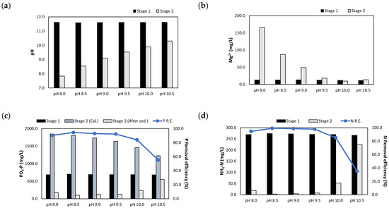 When the pH was adjusted to 10.5, the removal efficiencies of PO4-P and NH4-N were 55.3% and 35.1%, respectively. In this case, the injection volume of the (NaOH+H2SO4)_eluate was low, and the MgO was not sufficiently dissolved. In the pH range of 8.5–9.5, the PO4-P and NH4-N removal efficiencies reached 92.3–94.5% and 97.9–99.1%, respectively. At pH 8.0, the PO4-P and NH4-N removal efficiencies decreased slightly to 90.4% and 94.5%, respectively.