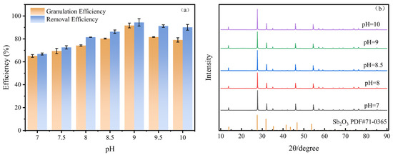 As illustrated in Figure 2a, the efficiency of Sb(III) removal and granulation at pH 7.0 were relatively low, with rates of 66% and 65%, respectively. Then, both the removal efficiency and the granulation efficiency went through a high-speed increase at a pH of 7.0–9.0 and gradually reached the maximum at pH 9.0, at 94% and 91%, respectively. However, both the removal and granulation efficiency began to decrease at a pH above 9.0. The removal efficiency and granulation efficiency dropped to 90% and 79% at pH 10.0, respectively.