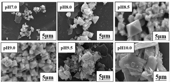 Figure 3 showed the morphology of the resulting products at pH 7.0–10.0. At pH 7.0, the products were irregularly shaped with a limited presence of cubic shape agglomerates. The shape of the products became much closer to octahedral, and the number of crystals also increased with the increasing pH, which, finally, achieved the optimum at pH 9.0. However, above pH 9.0, the products enlarged, leading to the gradual disappearance of the octahedral structure. As a result, the optimal pH for Sb(III) granulation was 9.0. This pH was used for subsequent experiments.