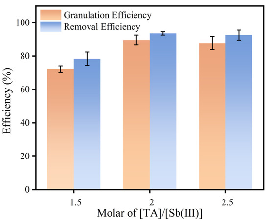 As shown in Figure 4, the granulation and removal efficiency were 72% and 78%, respectively, at a [TA]/[Sb3+] molar ratio of 1.5. As the molar ratio increased to 2.0–2.5, the removal and granulation efficiency arrived at a peak of 93% and 89%, respectively.