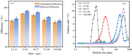 As shown in Figure 5a, with a seed size of 2.5–13 μm, the granulation and removal efficiency reached 80% and 83%, respectively. As it increased to 13–38 μm and 38–75 μm, the granulation and removal efficiency were higher at 13–38 μm and reached 93% and 95%. However, continuing to increase the seed size to 75–150 μm and 150–300 μm had a negative effect on the recovery of antimony.
