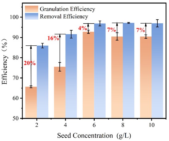The concentration of the seed is another factor that influences its specific surface area. Thus, seed concentrations of 2 g/L, 4 g/L, 6 g/L, 8 g/L, and 10 g/L were selected to determine the optimal dosage, as shown in Figure 6. The removal and granulation efficiency increased first, and then decreased. At the seed amounts were 2 g/L, the removal and crystallization efficiency were 85% and 65%, respectively. With the seed amounts increased to 6 g/L, the removal and granulation efficiency reached the maximum values of 96% and 92%. However, further increasing the seed concentration resulted in a deterioration of the granulation efficiency, while the removal efficiency remained relatively stable. The disparity in granulation and removal efficiency resulting from seed concentration warranted our attention.