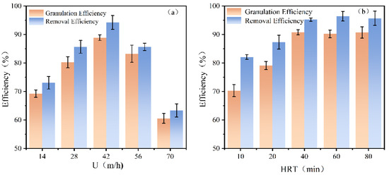 Changing reflux ratios is the way to vary the up-flow velocity in the FBR system [36]. In this study, 14, 28, 42, 56, and 70 m/h were selected for to investigating the optimal up-flow velocity for the granulation of antimony. As depicted in Figure 7a, the recovery efficiency increased with U in the range of 14–42 m/h, resulting in the removal and granulation efficiency of 94% and 88%, respectively. However, as the U was above 42 m/h, the antimony recovery began to decrease. At a U of 70 m/h, the removal and granulation efficiency decreased to 63% and 60%, respectively.