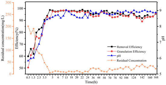 The results in the FBR were shown in Figure 8. At the start-up stage of the reactor, the effluent Sb3+ concentration decreased with the pH increasing to 9.0, which was regarded as the induced nucleation stage. At this stage, Sb3+ and OH− began to granulate on the surface of the seed, accompanied by the formation of a large number of homogeneous nucleated crystals. These crystals were small and may flow with the effluent, thereby leading to a high concentration of Sb3+ in the effluent. With the increase in time, the granulation and removal efficiency of antimony gradually increased and stabilized. The FBR had a short start-up time and achieved more than 90% removal within 3 h. Subsequently, Sb3+ granulated in a non-homogeneous phase upon the seed surface. During the following observed period (7 d), the FBR demonstrated a stable performance on the removal and granulation efficiency of 96% and 93%, respectively, suggesting that it had a potential for continuing the granulation process.