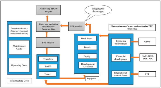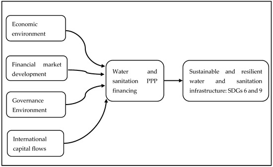 Other than economic and financial development variables, the governance environment influences the sustainable financing of water and sanitation PPPs. Either collectively or individually, the governance elements of the rule of law and the control of corruption, among others, exert influence on PPP finance. However, researchers at times report contrasting results about the relationship between the element of the governance environment and the financing of PPP infrastructure projects. For instance, contrary to [53,54], it was reported that, in selected developing countries, the more corrupt the economic environment is, the higher the level of PPP infrastructure investments. The studies used a count data model and pooled OLS, respectively. The researchers argued that, at times, project sponsors cannot entirely circumvent corruption. Similarly, the authors in [55] counter-intuitively reported the finding that a higher likelihood of political instability results in increased PPP infrastructure investments. This is contrary to [56], who postulated an inverse relationship between infrastructure investment and political instability. Using Tobit regression analysis, ref. [55] argued that citizen demand for better services expressed through political uprising may compel public authorities to use PPPs to increase investments in infrastructure. Conceptually, the relationship between determinants of PPP investment, elements of the economic environment, financial market development, the governance environment, and water and sanitation PPP financing is presented in Figure 1. The authors in [17] are among the few that have attempted to create a framework for public infrastructure financing in Zimbabwe. Their study provided a decision tool that can assist public authorities regarding whether a project is implemented or not. However instrumental the framework is, it is not sector-specific. Risk–return profiles are different across the infrastructure sector. The current study is water-and-sanitation-specific.