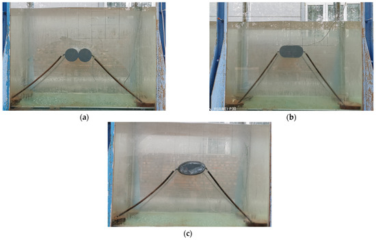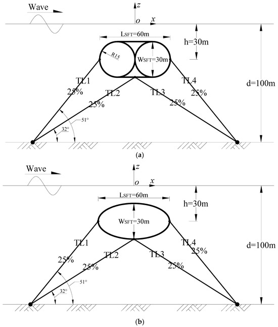 Figure 6 shows a detailed sketch of three different cross-section forms. The submerged depth, up-wave width, cross-section area, buoyancy–weight ratio (BWR = 1.20) and pretension of the SFT of each section are the same. In this paper, the twin-circular section is fixedly connected by two circular section pipes, the upper and lower parts are fixed by the beam, and the tension leg connects the middle point of the beam and the seabed. Different from the twin-circular section, the two sides of the ear section are semicircles with a diameter of 30 m, and the upper and lower parts are connected by straight walls. For the tension-leg-type SFT, four symmetrically arranged inclined mooring lines are set to limit the horizontal and vertical displacement of the structure. The specific parameters of the mooring system are shown in Table 2.