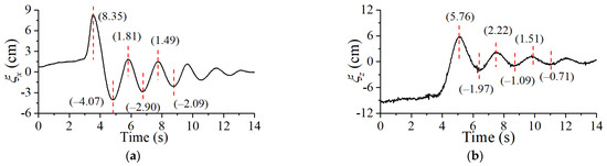 Free decay curves of twin-circular section SFT in still water: (a) in surge direction; (b) in heave direction.