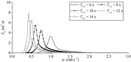In this paper, the irregular waves act on three types of SFT sections. The significant wave heights are all 4.0 m; the significant wave periods are from 6.0 s to 14.0 s. The comparisons of the wave power spectra are shown in Figure 8. The results show that the energy of long-period waves is more concentrated, and the energy is greater than that of short-period waves with the same wave height.