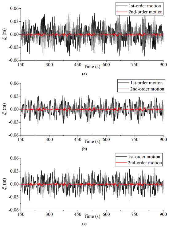 First- and second-order time history curves of SFT in surge direction: (a) twin-circular section, (b) elliptical section, (c) round rectangular section (T1/3 = 6 s).
