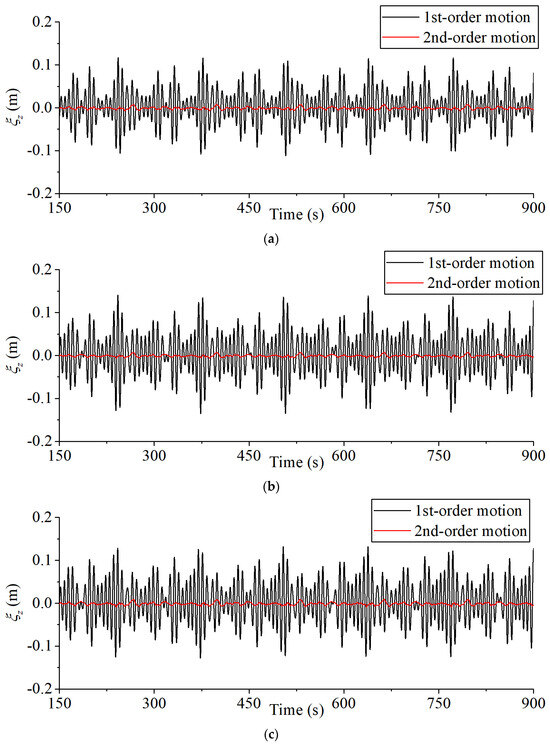First- and second-order time history curves of SFT in heave direction: (a) twin-circular section, (b) elliptical section, (c) round rectangular section (T1/3 = 6 s).