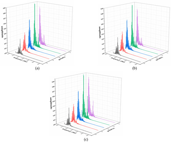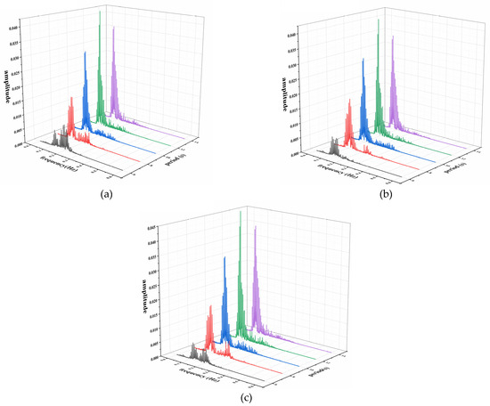 Then, the surge and heave displacement of each section is Fourier-transformed to obtain three-dimensional (3D) renderings under different significant wave periods, as shown in Figure 11 and Figure 12. The results show that the spectra in the surge direction present double-peak spectra under the action of irregular waves with short periods (T1/3 = 6 s, T1/3 = 8 s), and the frequencies correspond to wave frequency and natural frequency in the surge direction, which indicates that there are obvious motion characteristics at wave frequency and natural frequency under the action of short-period waves. The surge displacement spectrum presents a single peak spectrum phenomenon of wave action in an increase in wave period (T1/3 = 10 s, T1/3 = 12 s, T1/3 = 14 s), indicating that the SFT is mainly affected by wave frequency under the action of a long wave.