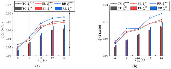 Then, the ratios of positive and negative maximum values to effective values are analyzed here, as shown in Figure 14 and Figure 15. On the whole, the dispersion degree of motion in each direction gradually decreases with an increase in the significant wave period. From the comparison of the dispersion degree of the three section forms, the motion of the elliptical shape section is the smallest in each direction, indicating that the elliptical shape SFT is relatively the most stable in all directions under irregular waves.