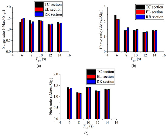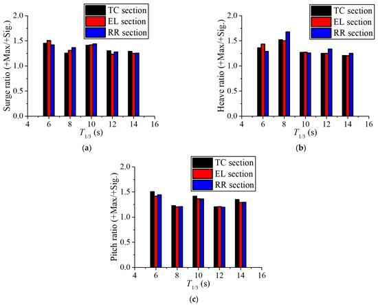 Comparisons of negative motion dispersion in each direction under different wave periods of different section forms: (a) surge ratio; (b) heave ratio; (c) pitch ratio.