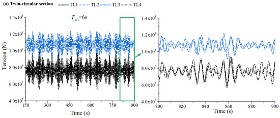Figure 16 shows the mooring tension time history curves of different section forms under irregular waves (significant wave period T1/3 = 6 s). It can be seen that the tension time history curves of each section are irregular, and the tension values of middle tension legs (No. 2 and No. 3) are greater than those of side tension legs (No. 1 and No. 4), and fluctuate up and down around their respective pretensions.