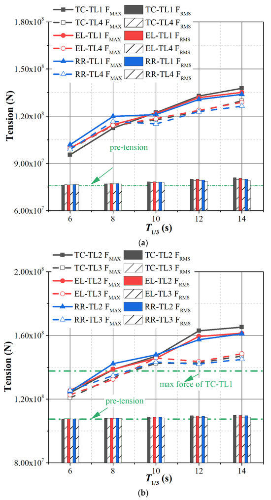 Mooring tension statistical analysis of different section forms: (a) TL1 and TL4; (b) TL2 and TL3.