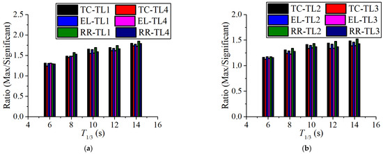 Figure 17 shows the statistical analysis of the tension of SFT with different sections and different periods. It is found that the RMS and maximum value of mooring tension increase with an increase in wave period. The second-order nonlinear motion of the SFT leads to the force on the up-wave tension leg being greater than that on the back-wave tension leg. Comparing the four mooring chains TL1 to TL4, it is found that the tensions of TL2 and TL3 are greater than those of TL1 and TL4. The reason is that the inclination of middle tension legs (TL2 and TL3) is relatively large; when the same vertical pretension is provided with side tension legs (TL1 and TL4), it is also necessary to provide greater horizontal stiffness. It is suggested that the tension leg stiffness of the SFT tension leg mooring should be moderately increased in the direction of the normal wave according to the actual sea conditions. The greater the inclination angle of the tension leg, the greater the stiffness also needs to be. Comparing the ratio of the maximum value and the RMS of each tension leg of SFT with different sections, as shown in Figure 18, it is found that the ratio increases with an increase in the wave period, and the ratio measured in the up-wave is greater than that measured in the back-wave through the comparisons, which proves that the up-wave tension leg bears greater tension changes. By comparing the three types of section forms, it is found that the tension ratio of the elliptical shape section is the smallest, which further proves that the elliptical shape section is more stable in irregular waves.