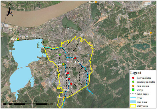 The drainage system within the modeling area consists of both a combined system and a separate system, with a total pipe network length of approximately 250 km. There is 1 wastewater treatment plant (WWTP) in the modelling area and 1 WWTP located at the downstream outsides, referred to as WWTP1 and WWTP2. Rainfall data are collected from 5 gauges located in Jiujiang, with 2 stations situated within the modeling area.