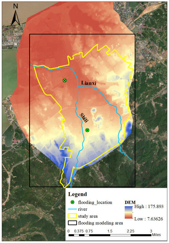 The Digital Elevation Model (DEM) data in LISFLOOD-FP was obtained by oblique photography, with an accuracy of 1 m × 1 m. Special terrains, such as those under bridges and dams, were processed separately to ensure an accurate result of ponding for places with comparatively lower elevation.
