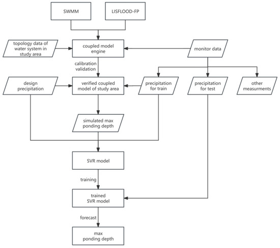 This study developed a coupled mechanistic flood model using the SWMM and LISFLOOD-FP models. The combined applications of the two-dimensional shallow water equation, the orifice/weir flow formula, etc., enabled an integrating calculation of the water exchange between the 1D and 2D models. This presented flood model was employed after calibration and validation to provide training data for SVR model predicting ponding in time. IDW interpolation method was applied to obtain precipitation data from various rain gauges for each elevated grid and its characteristics as max intensity (mm/5 min), accumulated volume (mm) and duration (h) were determined to be the features of SVR model. The outcome of SVR model as max depth during raining was testified by 2 monitored rainfall events, with a mean absolute error of 8.2%. This method benefitted a rapid calculation for ponding prediction, costing 1.0 min for 5 h simulation, saving 95% of the time for responses to spontaneous and emergency flooding events.