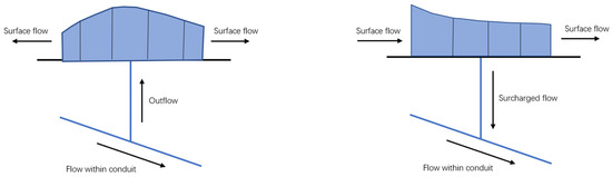 Schematic diagram of junction outflow (left) and surcharged flow (right).