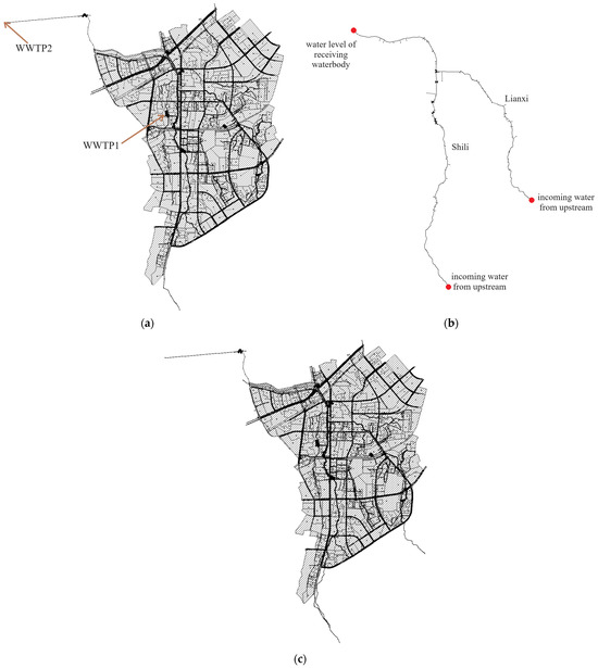 The network model and river model were integrated by coupling outlets to the corresponding river sections, describing the water exchange within two systems based on their hydraulics performance (Figure 5c).