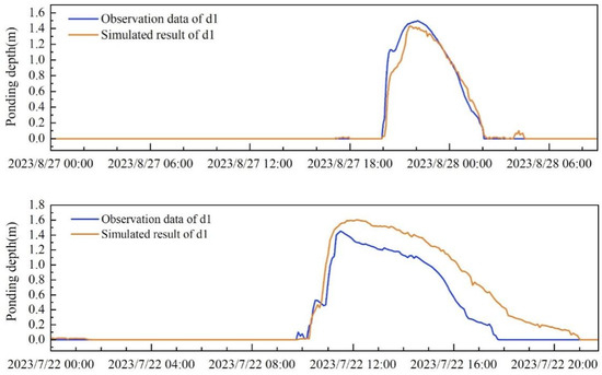The calibration and validation results of the 2D flood model at location d1 are shown in Figure 7. The calibrated NSE was evaluated to be 0.96, closely aligned with the measured result. For validation result, the absolute error of maximum ponding depth was approximately 12%, and the line indicating simulated ponding mitigation process was below the observed one, yet the appearance time of ponding and the speed of ponding decrease were well described.