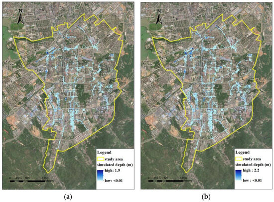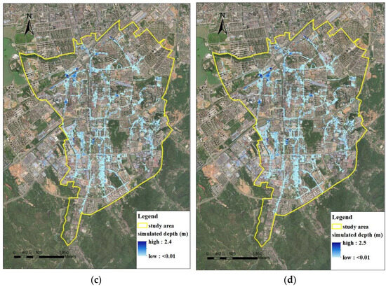 Flood maps of Lianghe generated by the coupled model under (a) the designed 3 h 1a rainfall, (b) the designed 3 h 2a rainfall, (c) the designed 3 h 3a rainfall, and (d) the designed 3 h 5a rainfall.
