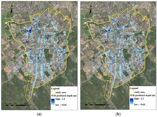 As mentioned above, only one ponding depth monitor was available in the whole study area. To achieve a comprehensive depiction of the flooding map within the entire area, multiple simulations under various design rainfall using the verified coupled model were carried out to generate ponding depth as training data for the SVR model.