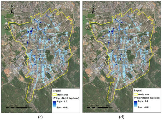 Flood maps of Lianghe generated by the SVR model under (a) the designed 1h 15a rainfall, (b) the designed 2 h 15a rainfall, (c) the designed 3 h 15a rainfall, (d) the designed 24 h 160 mm rainfall.