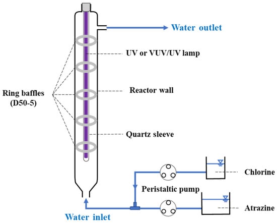 - Jia, L.; Chen, R.; Sun, Z.; Li, W.; Wang, H.; Qiang, Z. Degradation of micropollutants in flow-through VUV/UV reactors: Impact of internal diameter and baffle allocation. Chemosphere 2023, 335, 139112. [Google Scholar] [CrossRef]