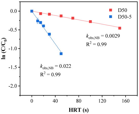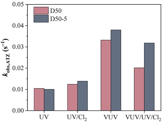 - The degradation of ATZ by UV, UV/Cl2, VUV/UV, and VUV/UV/Cl2 in the flow-through reactors followed the pseudo-first order reaction kinetics in general (R2 ≥ 0.90). The shift of light source from UV to VUV/UV significantly enhanced ATZ degradation. The kobs,ATZ with UV/Cl2 was just slightly larger than that with UV photolysis due to an unfavorable small reactor diameter, while the addition of chlorine to VUV/UV process decreased significantly the rate constant (e.g., from 3.32 × 10−2 to 2.01 × 10−2 s−1 in the D50 reactor). The implementation of baffles elevated the kobs,ATZ with the different UV-AOPs by 12–58%.