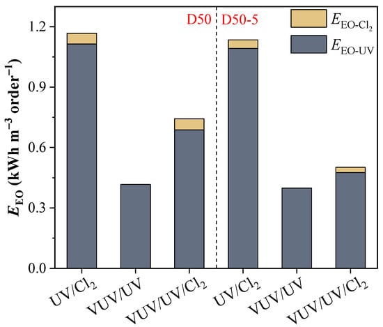 - The EEO values ranged from 0.42 to 1.11 and 0.40 to 1.09 kWh m−3 order−1 in the D50 and D50−5 reactors, respectively. The lowest EEO was consistently identified with the VUV/UV process and the baffled reactor had a slight advantage over the annular reactor. Collectively, the VUV/UV process in reactors with a proper diameter and baffle allocation is promising for ATZ removal in small-scale water treatments.