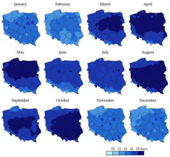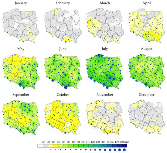 - Bednorz, E. Opady atmosferyczne. In Atlas Klimatu Polski (1991–2020); Tomczyk, A.M., Bednorz, E., Eds.; Bogucki Wydawnictwo Naukowe: Poznań, Poland, 2022; pp. 93–103. ISBN 978-83-7986-415-7. (In Polish) [Google Scholar]