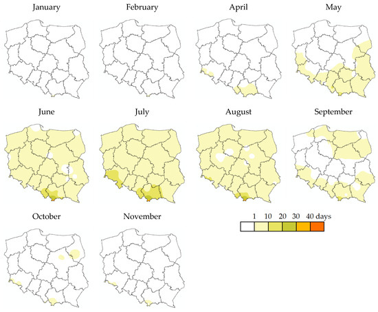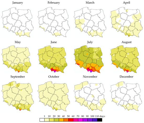 | Natural Hazard Zone | Country’s Area | Average Sum of Days with Precipitation in the Spring–Summer Season (from March to August) | Average Sum Days with Precipitation in the Autumn–Winter Season (from September to February) | ||||||