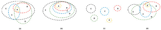 Different modes of estimating evidence from the system. (a) involves an integrated inclusion–sharing relationship between the estimation of evidence, in (b) only the inclusion relation prevails, (c) exhibits a kind of complete contradiction, and in (d) the dominant inter-evidence relation is communal; the latter two are more important because they are faced more often [28].