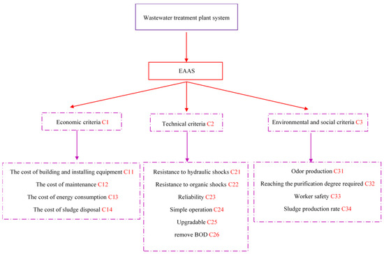 All the criteria and sub-criteria are selected based on the facts, compatible with the real conditions. In determining the main criteria of wastewater treatment it is of great importance that their selection and evaluation was performed based on the experiences gained from the design, implementation, and operation of these processes in selected cities. These criteria are introduced in the form of three main criteria, which are technical criteria, economic criteria, and environmental–social criteria. Due to the large dimensions of each of the defined criteria, sub-criteria were also defined to achieve better results for each of the criteria. The sub-criteria that were taken into consideration in the technical evaluation of the processes are resistance to organic and hydraulic shocks, continuous operation, simple operation, the possibility of upgrading, BOD removal, equipment construction and installation costs, maintenance, energy consumption, sludge disposal, odor production, reaching purification degree required, worker safety, and sludge production [1,22]. Figure 2 shows the criteria and sub-criteria of the EAAS system.