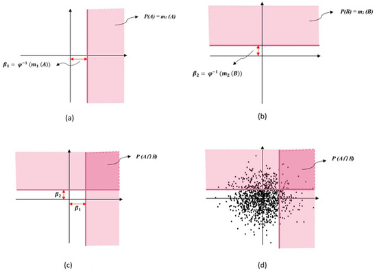 Decision fusion steps in the Monte Carlo algorithm. (a,b) the mapping of the opinions of experts A and B in the probability space, in (c) a common area has been calculated, which is equivalent to the probability estimation in the MC algorithm, (d) random samples was created based on the standard normal distribution function, and (β) is the reliability index, which, by definition, is the average distance of the limit state function from the probability region.