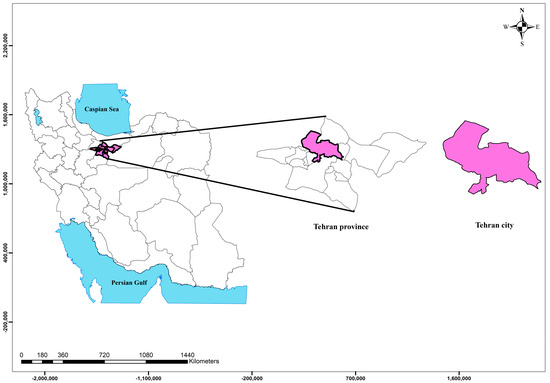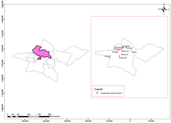 Spreading on the southern slopes of the Alborz Mountain range, Tehran (51°23′20″ E, 35°41′21″ N), capital of Iran, with a population of 9,259,009 (most populous) and area of 730 km2 (Figure 6) has been selected for this case study. It has a semi-arid climate with an average rainfall of 316 mm/year and an average annual temperature of 29 °C. In most years, half of its total annual precipitation is provided in winter, and summer is its least rainy season [44]. In Tehran, per capita drinking water consumption is 240 L/s, which is 70 L more than the national per capita (170 L/s). Here, 70% of the drinking water is supposed to be supplied from surface water and 30% from underground water, but a 64% decrease in rainfall has reduced the share of the former and increased that of the latter, which means using the water reserves of the future generation [45]. One of the efficient and practical ways to provide potable/non-potable water is to treat wastewater and reuse it in various industrial, agricultural, and domestic sectors to save water and reduce environmental pollution [46]. Due to the scarcity of water resources, treated wastewater is increasingly reused and is seen as a valuable resource that requires effective management with special care for human health, environmental protection, and water security. Due to limited technical and economic support and underdeveloped monitoring systems, many cities have inadequate wastewater treatment infrastructure. Therefore, the construction of suitable sewage treatment plants is very important because of its connection with the quality of surface and underground water [47]. According to the latest statistics published by the Water and Wastewater Engineering Company, Iran has a total of 237 treatment plants, of which 20, operating mainly under the activated sludge process (Figure 7), are in the Tehran province [48].