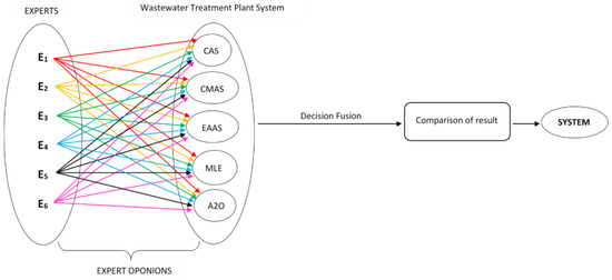 The ever-increasing growth of the world’s population and the significant progress of industry have enormously increased wastewater production in agriculture, industry, and domestic areas. The associated pollution, on the one hand, and the increased need for clean water, on the other hand, have made the construction of wastewater treatment plants a very serious environmental priority, with protection, planning, and management being quite important aspects when deciding on suitable treatment systems due to their high construction costs and their key role in providing services to citizens and protecting the environment; their incorrect selection will significantly increase the associated costs and prevent the achievement of the goals. The criteria for selecting a proper treatment system were determined considering existing research and the progress of the current research on selecting wastewater treatment plants, and then, the experts discussed them one by one based on the required objectives and principles. Five wastewater treatment systems were considered. (1) Conventional activated sludge (CAS). (2) Completely mixed activated sludge (CMAS). (3) Enhanced aeration activated sludge (EAAS). (4) Modified Ludzack–Ettinger (MLE); in the MLE method, a set of biological methods is used; these methods are a combination of aerobic and anaerobic treatment methods known as MLE activated sludge. (5) A2O; the A2O process is one of the methods used to treat industrial and sanitary wastewaters, which uses a combination of anaerobic, anaerobic, and aerobic conditions. This method, which is improved by AO, is used in order to provide conditions for the removal of phosphorus and nitrogen. These methods were considered based on (a) technical conditions (resistance against organic/hydraulic shocks, simple/continuous operation, upgradability, and BOD removal), (b) economic conditions (costs of construction, equipment, installation, maintenance, energy consumption, and sludge disposal), and (c) environmental conditions (smell release, required degree of treatment, worker safety, and sludge production). In the data fusion process, related experts were asked to rank the mentioned systems according to their importance. Table 5 shows their opinions about the systems proposed for Tehran; the last column shows the experts’ degree of uncertainty about their opinion (Ѳ). For instance, 0.1 for expert 1 indicates that they are 10% unsure about their opinion; this is 5% for expert 2, 15% for expert 4, 10% for expert 5, 5% for expert 6, and 0% for expert 3 (they are quite confident and not uncertain about their opinion).