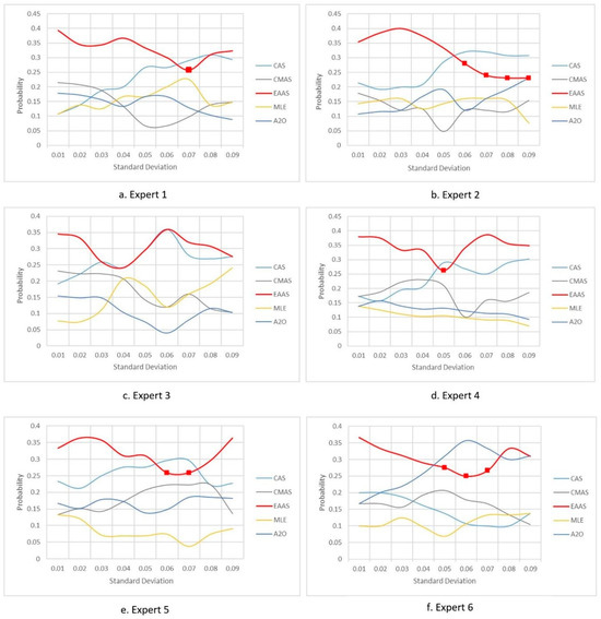 As can be seen in Figure 9, as the value of the standard deviation changes, the EAAS system is selected as the superior system in most cases. In Figure 9c, it can be seen that according to the change in the value of the standard deviation, the EAAS system was selected as the superior system in all cases, so it can be concluded that the third expert provided an estimate of the systems with great accuracy. But in the case of other experts, the priorities may have changed in some values, which is more the case for the second expert than other experts. As we know, if the standard deviation of a set of data is close to zero, it is a sign that the data are close to the mean and have little dispersion. While a large standard deviation indicates significant dispersion of the data. In all the figures, the change in priorities has occurred at a standard deviation above 0.05, that is, when we have moved away from the initial uncertainty and the uncertainty has increased more than the initial state. As is clear in Figure 8, these changes for expert 1 occurred at the standard deviation of 0.07, for expert 2 in the interval (0.06–0.09), for expert 4 at the standard deviation of 0.05, for expert 5 and expert 6 in the interval (0.06–0.07). To estimate the amount the probabilities changed in this part compared to the initial probability, based on which the EAAS system was selected as the superior system, the growth rate (GR) can be used. Looking at the calculated probabilities for the EAAS system in Figure 8 compared to the initial state, it can be concluded that the reduction in the estimated probability of expert 1 at SD = 0.07 is 25.14%, expert 2 at SD = (0.06, 0.07, 0.08, 0.09) corresponds to 18.79%, 30.39%, 33.06%, and 33.06%, respectively. For expert 4 at SD = 0.05 is 23.67%, expert 5 at SD = (0.06, 0.07) is 24.79% and 24.79%, respectively, and finally, for expert 6 at SD = (0.05, 0.06, 0.07) the reductions in the estimated probability are equal to 19.98%, 27.49%, and 22.65%, respectively. Table 8 shows the effect of a random Ѳ on the reduction in choice percentage for the EAAS system.
